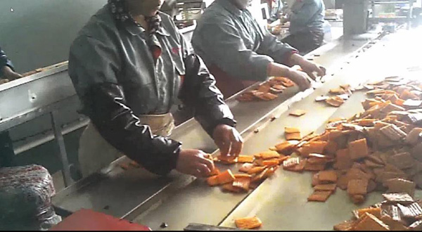 位于河南省通許縣工業(yè)園的開封勁松食品有限公司生產(chǎn)廠房內(nèi),工人直接用手將辣條一塊塊裝入塑料包裝袋(3月7日攝 視頻截圖)。