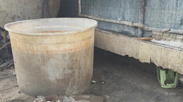 位于河南省通許縣工業(yè)園的開封勁松食品有限公司生產(chǎn)廠房內(nèi),運送辣條的藍(lán)色塑料箱上面布滿黑色的污物和油漬(3月7 日攝 視頻截圖)。