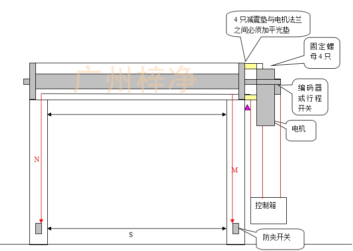 2、裝卷軸:(要求鏍絲墊片按說(shuō)明裝,聯(lián)接牢固)裝卷軸抬起分別與M、N門框相連接;