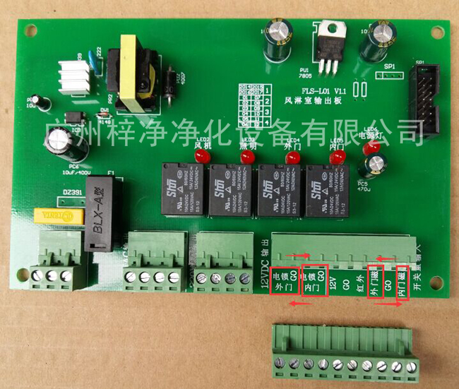 第二種方法:拆開(kāi)風(fēng)淋室控制器那塊檢修板找到風(fēng)淋室副板如下圖,把風(fēng)淋室的前后門鎖及前后門磁線互換一下就可以了。