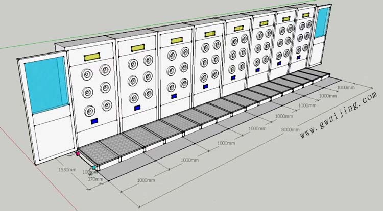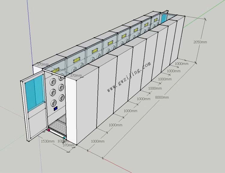 風(fēng)淋通道選型標(biāo)準(zhǔn)一般要選擇深度為2000mm、3000mm、4000mm、5000mm、6000mm以上,本文為8米長(zhǎng)風(fēng)淋通道安裝立體圖分享。