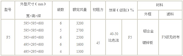 F5級(jí)袋式中效過(guò)濾器標(biāo)準(zhǔn)技術(shù)參數(shù):