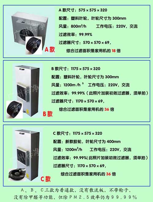 家用FFU獨(dú)特風(fēng)道(阿基米德螺旋線風(fēng)道)設(shè)計(jì)。A款B款C款家用FFU凈化器性能對(duì)比
