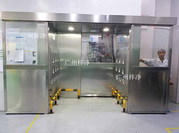 自動門風(fēng)淋室與自動門貨淋室并設(shè)有光電感應(yīng)器,單向通道風(fēng)淋室,從非潔凈區(qū)進(jìn)入,關(guān)門后紅外線感應(yīng)有人就吹淋,吹淋后入門鎖閉,只能從出門走出風(fēng)淋室;