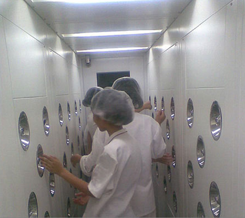 定義:為了減少由于人員進出所帶來的大量塵埃粒子,經高效過濾器過濾后的潔凈氣流由可旋轉噴嘴從各個方向噴射至人身上,有效而迅速清除塵埃粒子,清除后的塵埃粒子再由初、高效過濾器過濾后重新循環(huán)到風淋區(qū)域內。