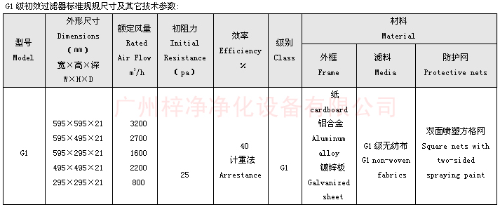 G1級初效過濾器標(biāo)準(zhǔn)規(guī)規(guī)尺寸及其它技術(shù)參數(shù):