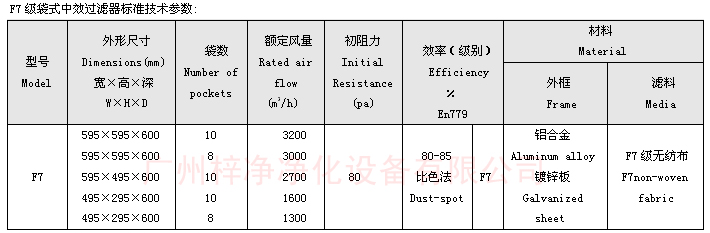 F7級(jí)袋式中效過(guò)濾器標(biāo)準(zhǔn)尺寸技術(shù)參數(shù)