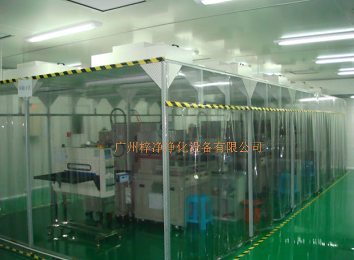 軟簾潔凈工作棚又稱為薄膜潔凈棚、軟簾凈化棚等,軟墻潔凈棚采用工業(yè)鋁材(或不銹鋼方通、鐵方通噴塑)作為框架,風(fēng)機濾網(wǎng)機組(FFU)送風(fēng),四周懸掛防靜電垂簾(或鋼化玻璃),其內(nèi)部凈化級別可達(dá)到100-10000級。軟簾潔凈工作棚適用于操作區(qū)內(nèi)局部凈化級別要求高的區(qū)域。