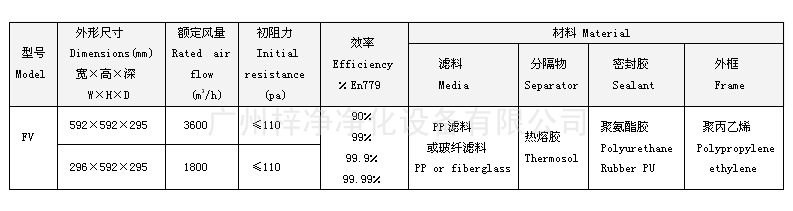 FV組合式亞高效過濾器型號、尺寸及其它參數(shù):