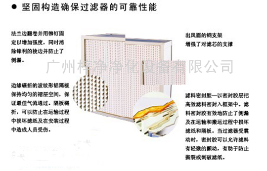 濾料超細(xì)玻纖濾紙、密封膠 PU雙組份聚氨酯膠,框體 鋁型材、鋁板、鍍鋅板、不銹鋼、木框分隔物 120g/┫膠板紙或0.035mm厚鋁箔,密封膠條 PU聚氨酯發(fā)泡膠、EVA、氯丁橡膠、過濾效率 99.99%~99.995% @ 0.3μm使用最高溫度 80℃;使用最高濕度 80%;鋁型材可選厚度 120~220mm