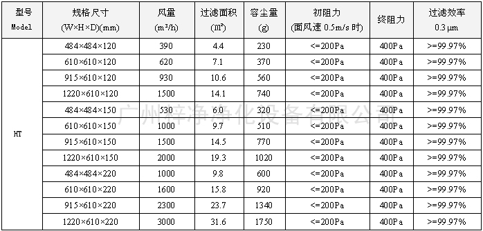 250度耐高溫高效空氣過濾器尺寸風(fēng)量容塵量技術(shù)參數(shù):