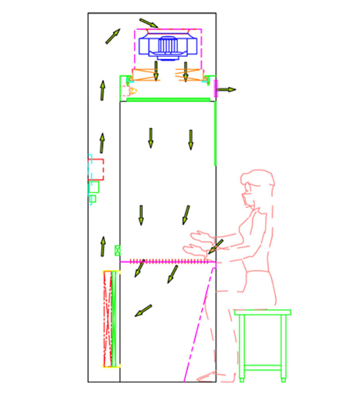 潔凈氣流被送至送風(fēng)箱體內(nèi),90%通過均流送風(fēng)網(wǎng)板,形成均勻的垂直送風(fēng)氣流,10%則通過風(fēng)量調(diào)節(jié)板,排出設(shè)備。所有氣流均經(jīng)過高效過濾器處理,所以送風(fēng),排風(fēng)均不帶殘余粉塵,避免了二次污染。