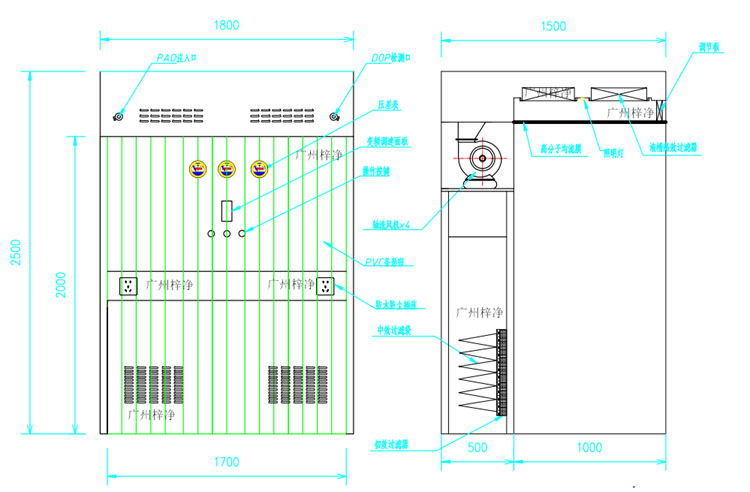 1、過濾器:初效過濾器、中效過濾器、高效過濾器三級過濾,液槽高效過濾器(效率:99.99%~99.999%@0.3μm),可滿足DOP或者PAO的測試要求;