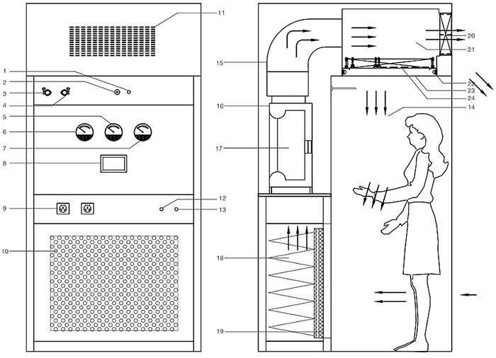 蜂鳴器2.風(fēng)速傳感器 3.PAO注入口 4.DOP檢測口 5.中效壓差表 6.初效壓差表 7.高效壓差表 8.集中控制屏 9.防塵插座 10.回風(fēng)網(wǎng)孔板 11.排風(fēng)網(wǎng)孔 12.啟動(dòng)按鈕 13.急停 14.負(fù)壓區(qū) 15.風(fēng)管 16.風(fēng)機(jī)箱 17.風(fēng)機(jī) 18.袋式中效過濾器 19.初效過濾器 20.液槽高效過濾器1 21.正壓區(qū) 22.照明燈具 23.均流膜